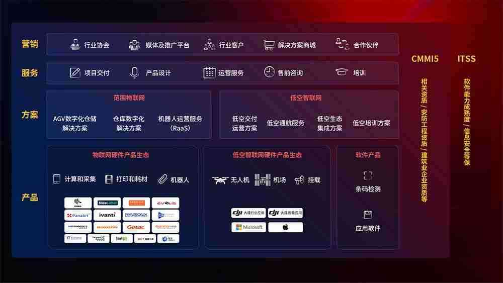 聚合国内外先进的物联网硬件产品品牌,,聚焦数字化仓储、、、、机器人运营、、、、低空智联网等领域,,,共同打造适合客户业务场景的解决方案并提供交付服务